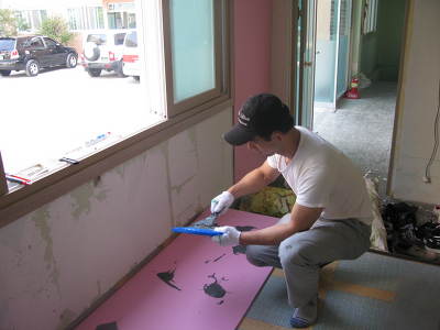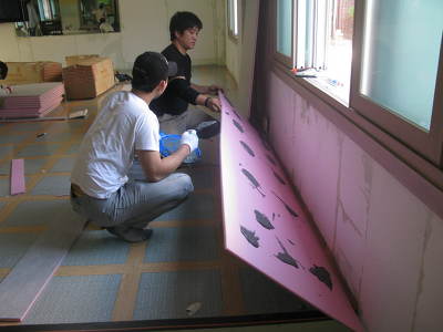 이보드 전용본드인 G2본드를 헤라 등으로 묻혀 약 30cm 간격으로 이보드의 뒷면(단열재면)에