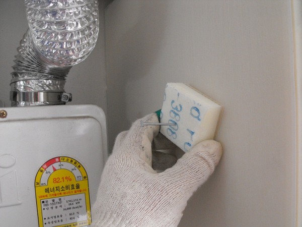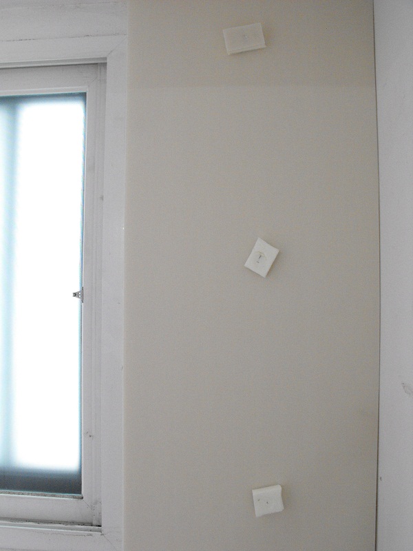 조각을 내어 뒤집어서 피스를 박아 고정하는데, 양생 후 제거할 것이므로 지나치게 힘을 주지 않고 살짝 벽체에 박히는