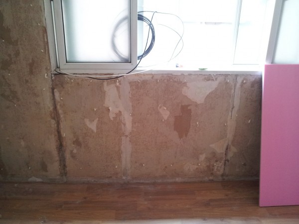 이보드 시공전 벽지를 모두 제거한 후 군데군데 못 자국 등이나 금이 간 곳에는 우레탄으로 메꾸어 준 후 여분의 부풀어진 폼은 잘라냅니다.