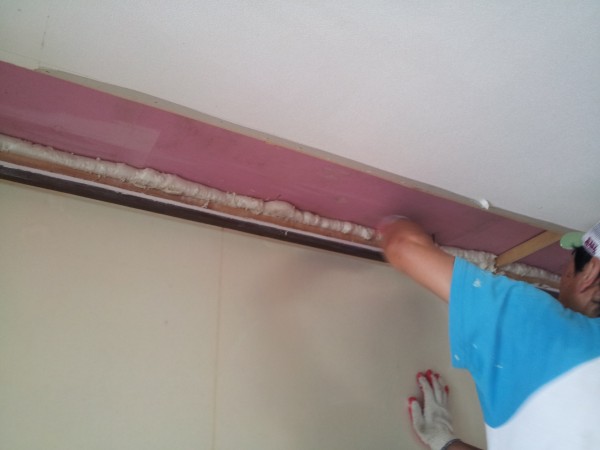 훼손된 석고보드를 부분적으로 잘라내고 단열재가 비어있는 틈새 등을 우레탄 폼을 사용해 빠짐없이 채워줍니다.